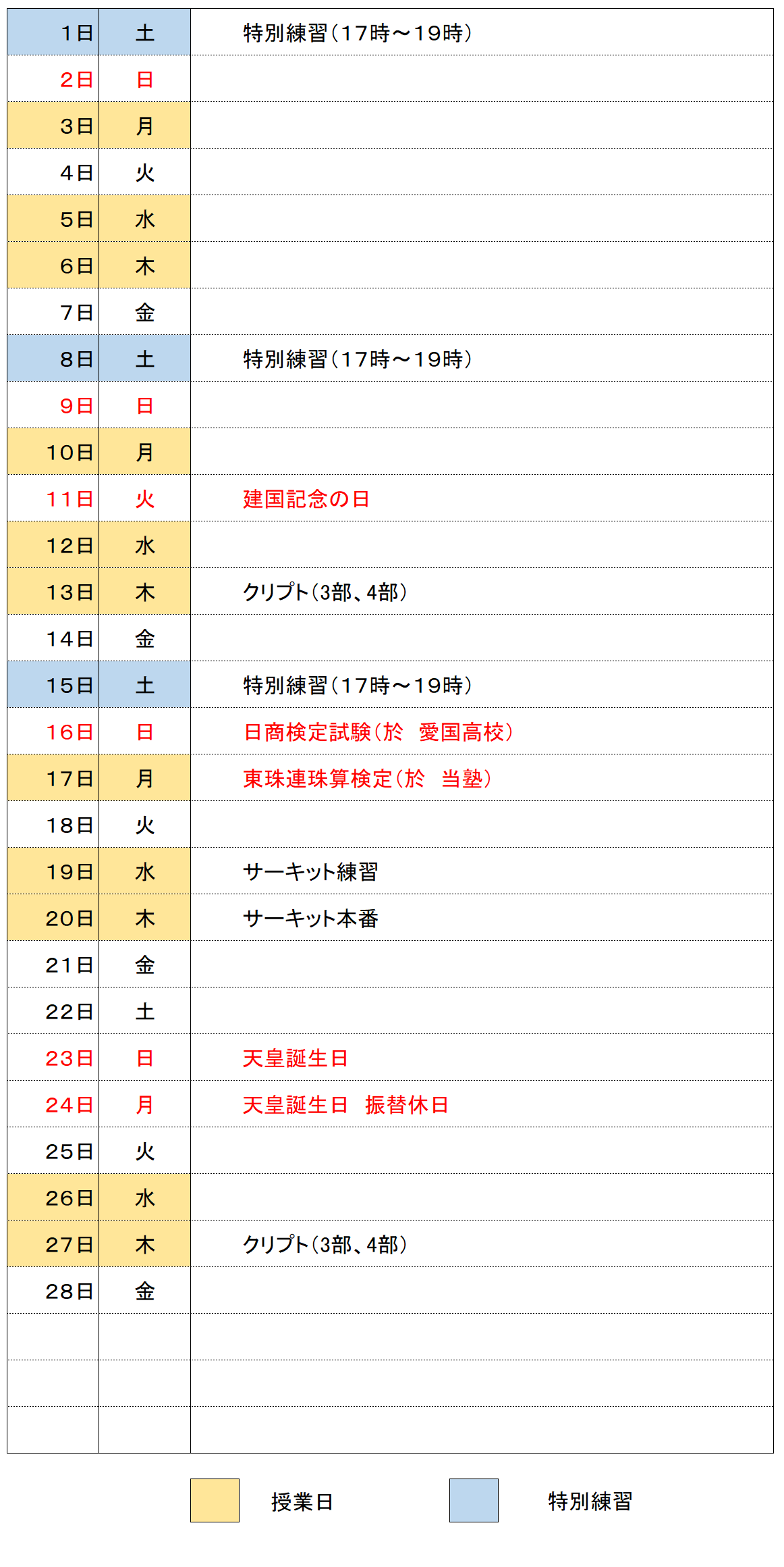 2025年2月の予定表